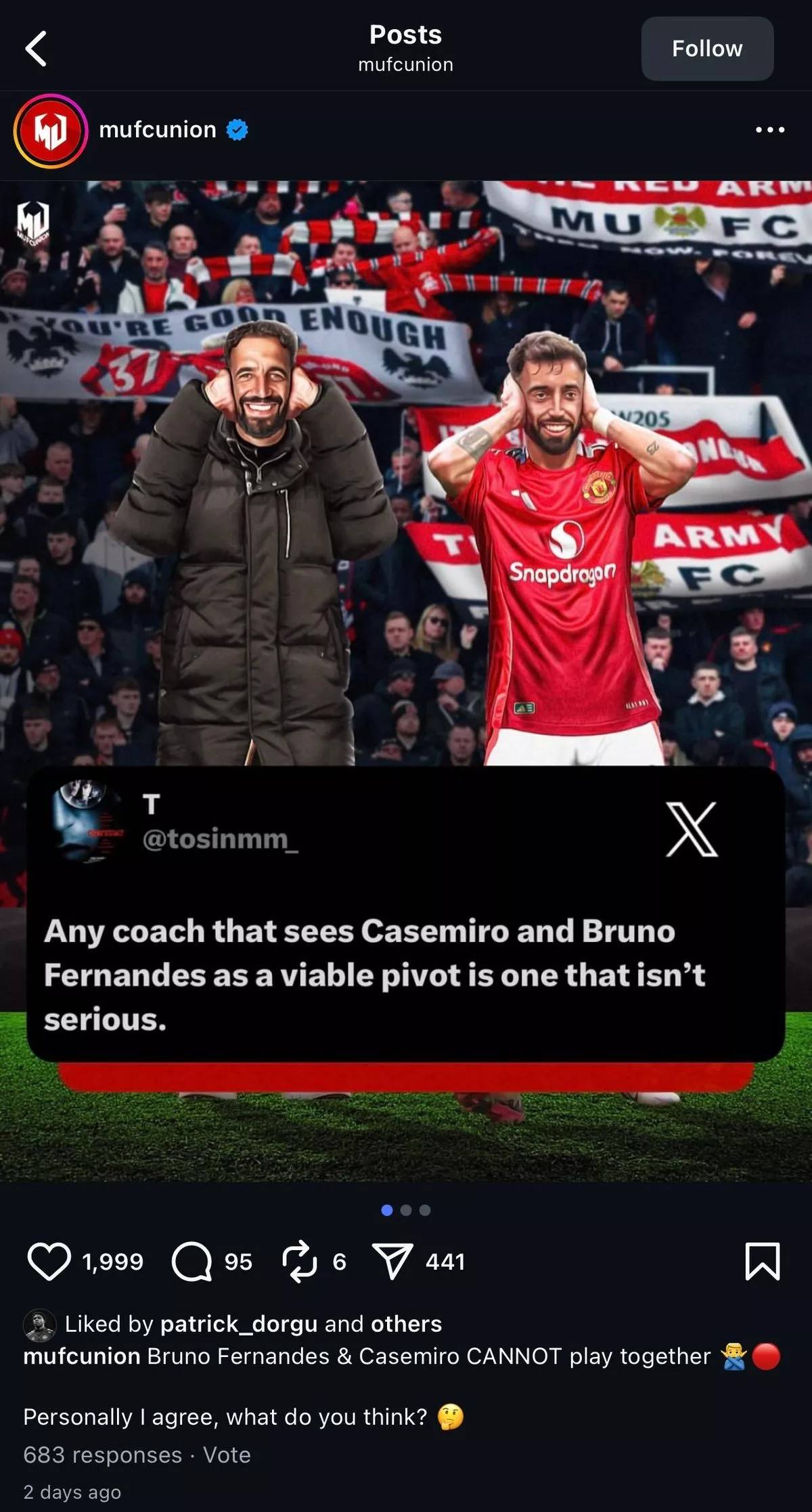 กลยุทธ์ของอโมริมดูเหมือนจะถูกตั้งคำถามในสัปดาห์นี้โดยนักเตะที่เขาดึงตัวมาร่วมทีมด้วยตัวเอง แบ็กซ้ายอย่างปาตริซิโอ โดจ ซึ่งย้ายมาร่วมทีมด้วยค่าตัว 30 ล้านยูโรเมื่อต้นปีนี้ ได้กดไลค์โพสต์ในโซเชียลมีเดียที่วิจารณ์ผู้จัดการทีมแมนเชสเตอร์ ยูไนเต็ดอย่างรุนแรง พร้อมทั้งสนับสนุนให้คาเซมิโรและบรูโน่ แฟร์นันด์สได้ลงเป็นตัวจริง