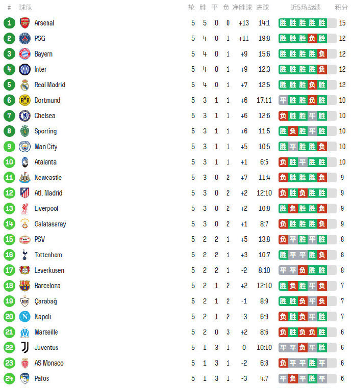 เมื่อวันที่ 27 พฤศจิกายน 2025 ตามเวลาปักกิ่ง การแข่งขันทั้งหมดของรอบที่ห้าของรอบแบ่งกลุ่มยูฟ่าแชมเปียนส์ลีก 2025-26 ได้สิ้นสุดลงแล้ว หลังจากการแข่งขันรอบนี้ อันดับมีการเปลี่ยนแปลงอย่างมากในการแข่งขันที่ทุกคนรอคอยอย่างมาก อาร์เซนอลสามารถเอาชนะบาเยิร์น มิวนิกได้ถึงบ้านด้วยสกอร์ 3-1 ชัยชนะครั้งนี้ทำให้ทีมปืนใหญ่กลายเป็นทีมเดียวที่ยังไม่แพ้ใครและมีสถิติสมบูรณ์แบบหลังจากผ่านไป 5 นัด ทำให้พวกเขายืนหยัดอย่างมั่นคงบนตำแหน่งจ่าฝูงของกลุ่ม