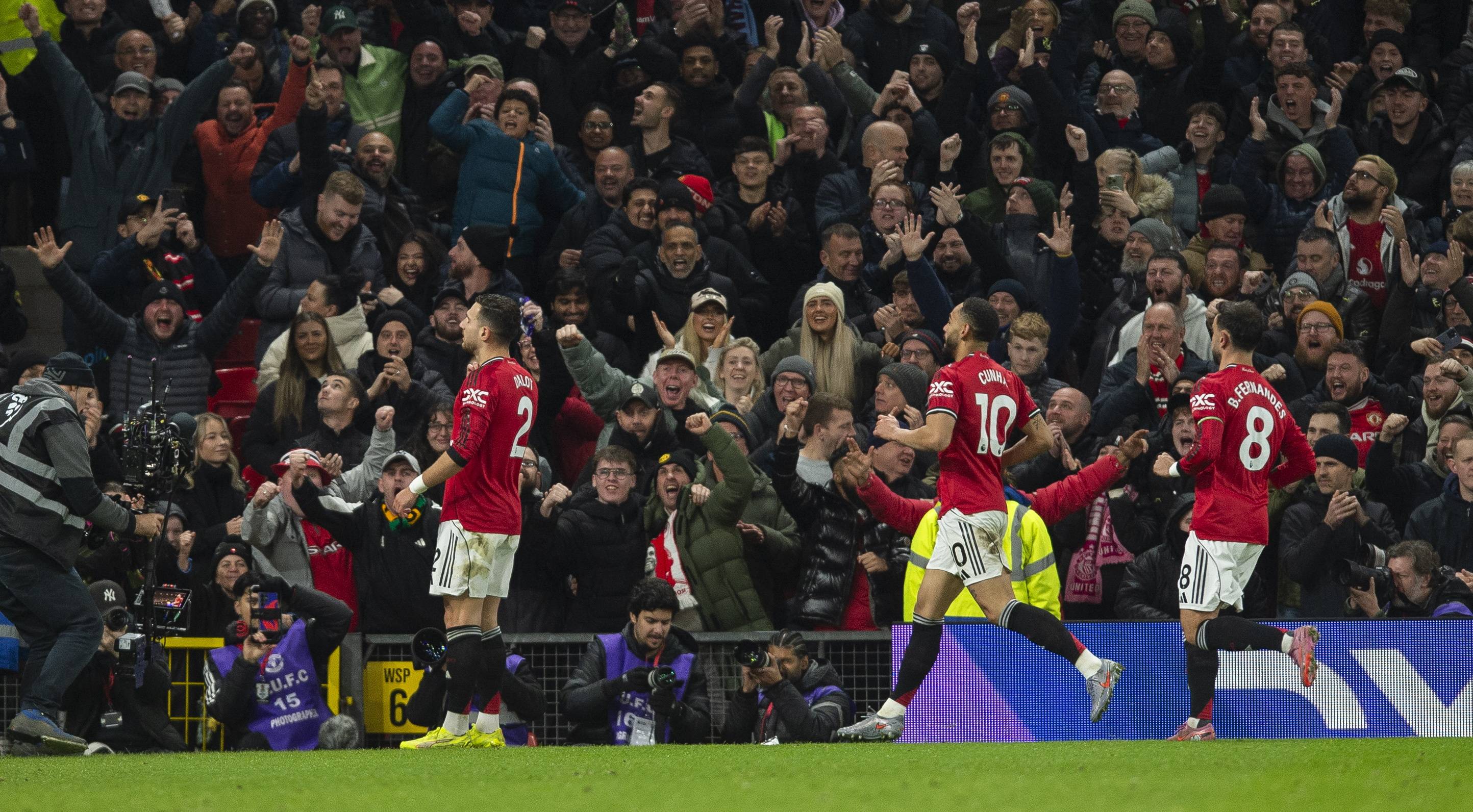 เมื่อวันที่ 4 ธันวาคม นักเตะแมนเชสเตอร์ ยูไนเต็ด ดิโอโก้ ดาโลต์ (ซ้าย) ฉลองการทำประตู Xinhua/EPA