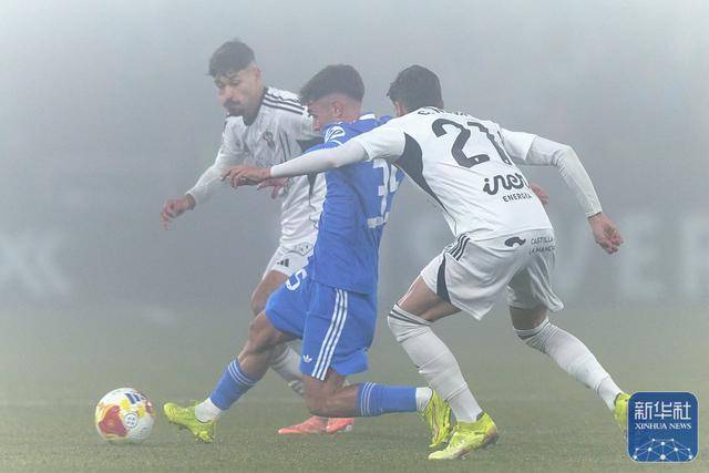 คาร์ลอส เนเวส (ขวา) ผู้เล่นของอลาเบส และดาบิด ฆิเมเนซ (กลาง) ผู้เล่นของเรอัล มาดริด แย่งชิงบอลระหว่างการแข่งขัน