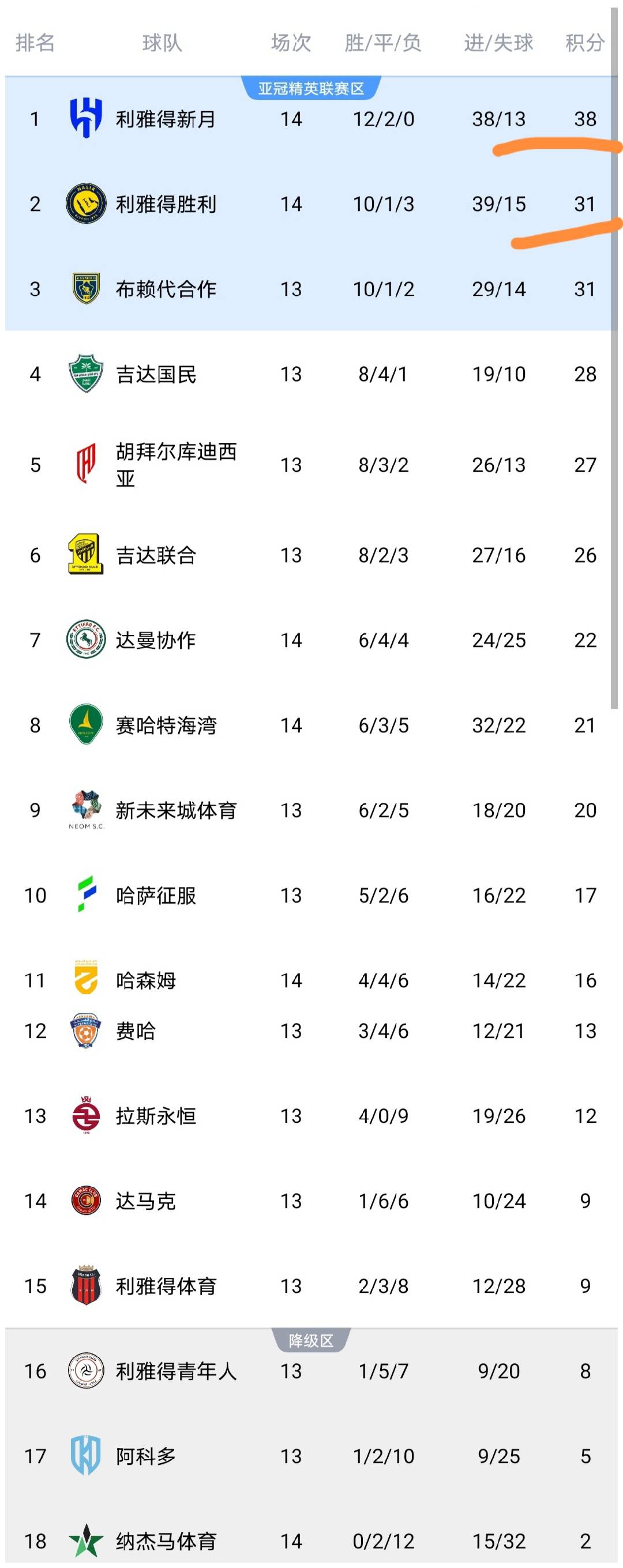 จากตารางลีก จะเห็นได้อย่างชัดเจนว่า อัล นาสร์ ภายใต้การนำของคริสเตียโน โรนัลโด ได้ประสบความพ่ายแพ้ไปแล้ว 3 นัด ทำได้ 39 ประตู และเสีย 15 ประตู ด้วยคะแนน 31 คะแนน พวกเขาตามหลังผู้นำอย่าง อัล ฮิลาล อยู่ 7 คะแนน อัล นาสร์ เปลี่ยนจากผู้นำมาเป็นทีมที่ตามหลังผู้นำอยู่ 7 คะแนนได้อย่างไร?นี่เป็นเพียงชะตากรรมของคริสเตียโน โรนัลโดหรือไม่ – ที่ถูกกำหนดให้ไม่เคยคว้าแชมป์รายการแข่งขันในซาอุดีอาระเบีย? หวังว่าจะไม่เป็นเช่นนั้น ด้วยความทุ่มเทเช่นนี้ โรนัลโดสมควรได้รับแชมป์ที่เหมาะสม