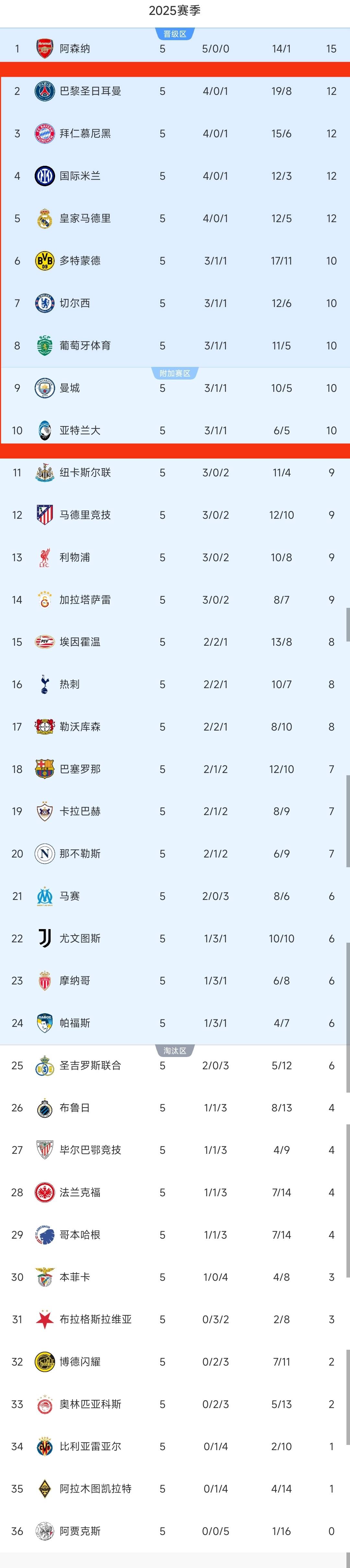 ด้วยชัยชนะ 5-3 ของปารีส แซงต์-แชร์กแมง เหนือท็อตแน่ม ฮ็อตสเปอร์ ซึ่งเป็นการปิดฉากการแข่งขันรอบที่ห้าภาพรวมล่าสุดของการผ่านเข้ารอบยูฟ่าแชมเปียนส์ลีกได้ปรากฏขึ้นแล้วอาร์เซนอลเอาชนะบาเยิร์น มิวนิค 3-1 ทำให้ทีมปืนใหญ่กลายเป็นทีมเดียวที่เก็บชัยชนะได้ครบทุกนัด ขึ้นนำเป็นจ่าฝูงของกลุ่ม ในบรรดาแปดทีมที่ผ่านเข้าสู่รอบน็อคเอาท์โดยตรง พรีเมียร์ลีกและบุนเดสลีกาต่างคว้าโควต้าทีมละสองทีม อันดับโดยรวมยังคงสูสีอย่างมาก โดยมีเพียงสองคะแนนเท่านั้นที่แบ่งอันดับสองถึงสิบ
