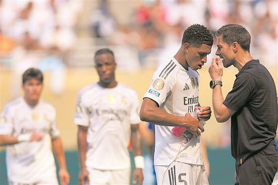18 มิถุนายน 2025: ผู้จัดการทีมเรอัล มาดริด อลอนโซ่ (ขวา) กำลังให้คำแนะนำกับผู้เล่น เบลลิงแฮม ระหว่างการแข่งขัน